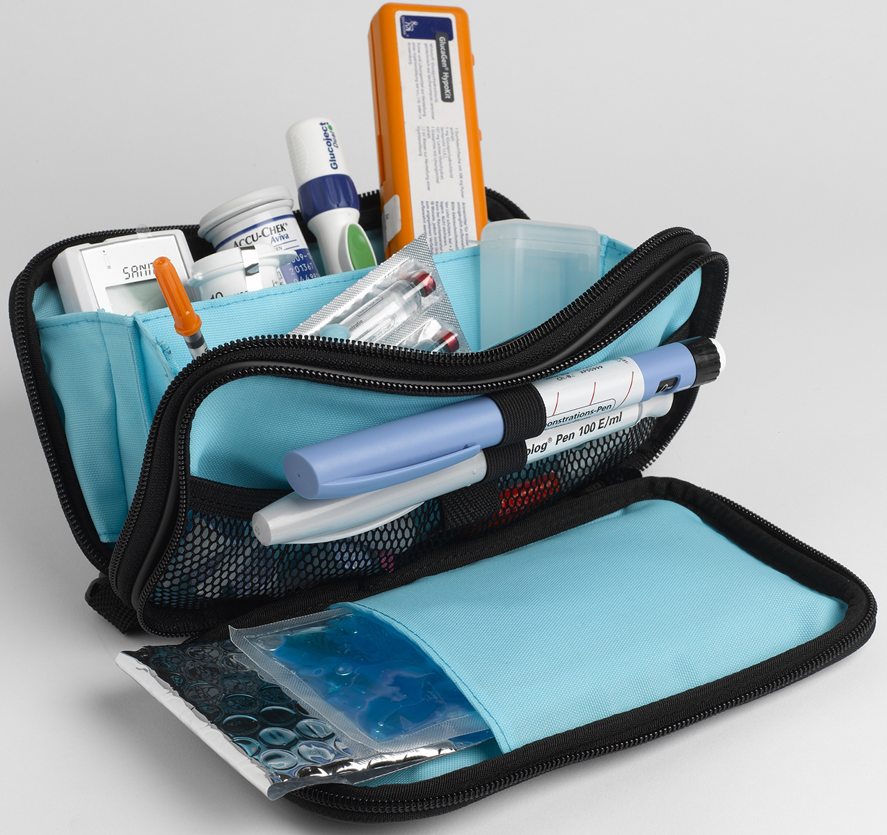 Ausstattung: Große Reißverschlussfächer, Schlaufen für Pens, abnehmbare Tragesschlaufe, viele Einzelfächer und Netzfach für Kleinteile, zusätzliche Außentasche, Sichtfenster für Diabetikerausweis, inklusive Kühlelement (ohne weiteren Inhalt!).
