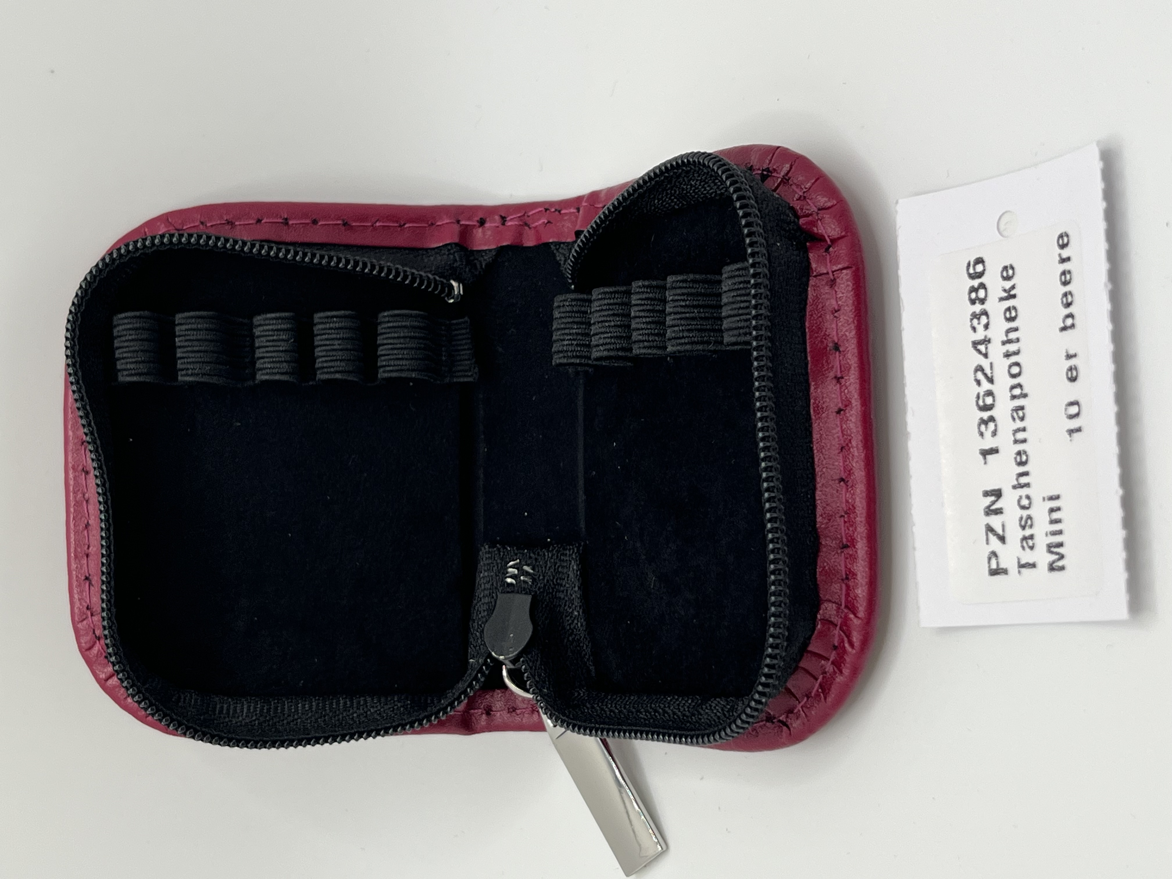 Das weiche Velours Innenfutter sowie die farblich angepassten Schlaufen ermöglichen ein übersichtliches Einsortieren der Röhrchen und einen sicheren Schutz vor Stößen. Ein gutgängiger Reißverschluss mit edlem Metallzipper rundet die Optik dieser Taschenapotheke Mini ab.